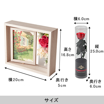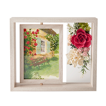 華やかなバラのプリザーブドフラワーと白い木目調の回転式フォトフレームを一緒にお楽しみいただける、お祝いに相応しい電報です。フォトフレームにはLサイズ(89×127mm)の写真を飾ることができます。