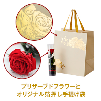 プリザーブドフラワー(一輪のバラ)と台紙を美しい金色の箔を施したオリジナルの手提げ袋でお包みし、お祝いの気持ちを品よく演出します。