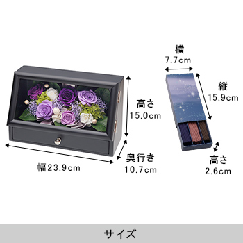 厳かな雰囲気の紫色のバラを中心にアレンジしたプリザーブドフラワーです。コンパクトな本体の引き出し部分に、お手持ちのお線香やろうそくなどを収納することもできます。日本香堂製の3種のお線香を添えてお届けします。(白檀、白梅、ラベンダーの香り)