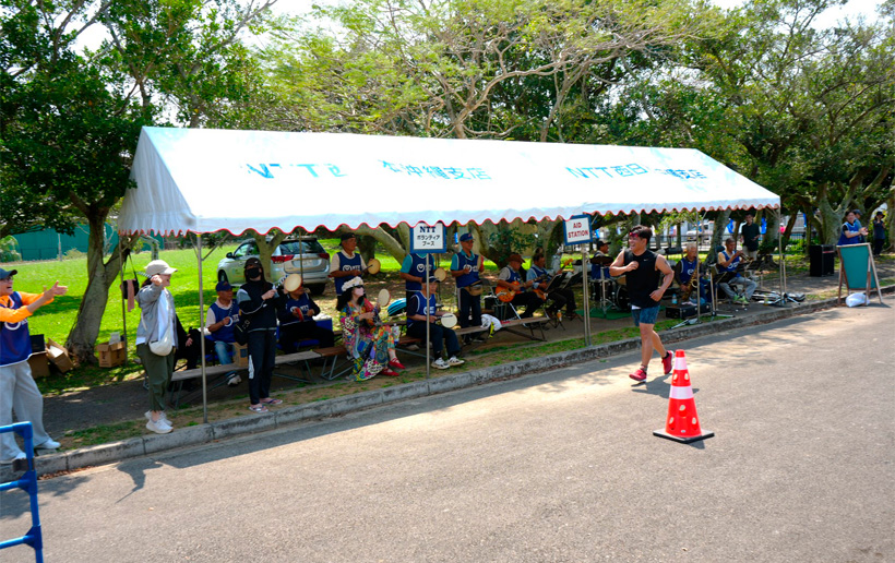 NTTビジネスソリューションズ 沖縄ビジネス営業部 八重山営業所とNTTフィールドテクノ 沖縄設備部 八重山センタのメンバーが中心となったエイドステーションは、今年もレース終了まで休むことなく給水とバンド演奏による熱いエールを送り続けました。レースに出場するメンバーが多数となった影響もあり、ボランティアスタッフは1つのステーションに集約、対面のステーションは地域のスポーツ少年団が担当し、協力し合う形でRUNコース中盤のポイントを支えました。
