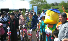 今回は、特別に、マスコットも応援に駆けつけてくれました。堺市の浜寺公園をはじめとする公園緑化推進、運営管理などをされている「大阪府公園協会」のマスコットキャラクター「パーキィ君」と、京都エリアで里山保全につながる農村と都市の共存共栄の活動をされている「いのちの里京都村さん」のマスコットキャラクター「シカナイさん」です。暑いぐらいの五月晴れの中、子ども達はじめ、みんなが楽しく、記念植樹と、草刈をすることができました。