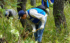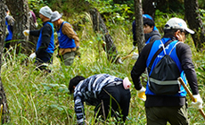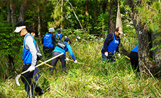 参加者は指定エリアに移動し、「風に負けない大きな木に育ってほしい」という願いを込めて下草刈りを行い、生い茂る草に苦戦しながらも普段使い慣れない鎌を手に汗を流して、約1時間の作業を終えました。