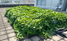 NTTビルの屋上に設置したプランターへサツマイモのつる苗を植え付け、成長した葉が屋上に広がることで直射日光を遮り、建物内部の温度上昇の抑制につなげています。