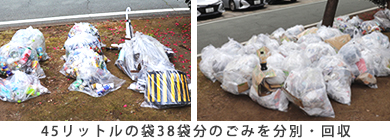 約2時間にわたる清掃活動の結果、マラソンコースおよび周辺地域から回収したごみは45リットル袋38袋分にのぼり、熊本市へ回収を依頼いたしました。
