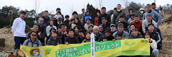 2026年2月28日(土)、大分県民の森・平成森林公園内「さくら園」において、「第30回ボランティアによる森林づくり」(主催:森林ネットおおいた)が開催され、NTT西日本 大分グループの社員およびその家族、約50名が一般ボランティアの皆さんとともに参加しました。