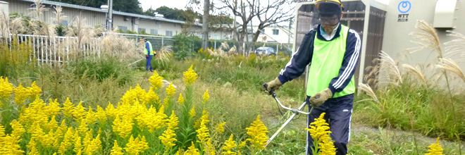 NTT West Fukui Group carries out weeding activities yearly from May to October at company housing areas, sites where bachelors' apartments were located and inside the premises of unmanned switching centers throughout Fukui Prefecture. In FY2016, weeding was performed at 29 out of the total of 44 sites.