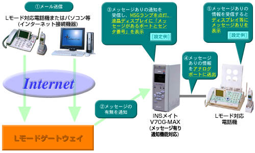 INSメイトV70G-MAXは、Lモードゲートウェイからメッセージありの通知を受信したときに、本体のMSGランプを点灯させるとともに、液晶ディスプレイにメッセージが届いているポート番号と、Lモードセンタ番号を表示します。また、アナログポートに接続したLモード対応電話機にその情報を通知します。