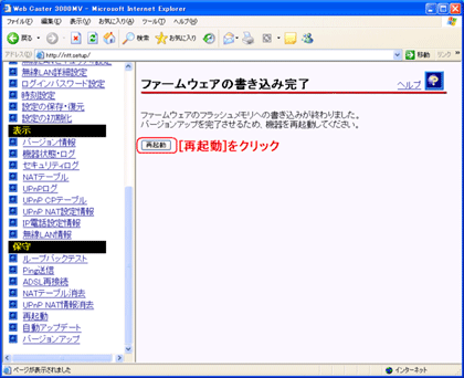 - 「再起動」をクリックします。新しいファームウェアで再起動します。アラームランプの点滅が終了したら、再起動の終了となります。