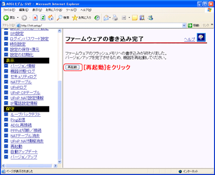 - 「再起動」をクリックします。新しいファームウェアで再起動します。アラームランプの点滅が終了したら、再起動の終了となります。