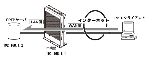 | LAN側のPPTPクライアントの設定を実施しても、PPTPの接続が失敗する場合は、<利用例2>を参照し、本商品に静的IPマスカレードの設定を行ってください。 |