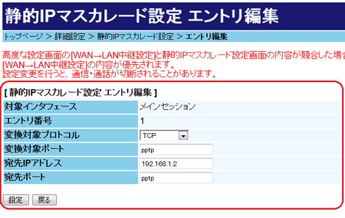 LAN側のPPTPサーバへWAN側のPPTPクライアントからアクセスする場合は、本商品へ静的IPマスカレード設定が必要です。