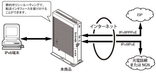 本機能は、ご契約のプロバイダが、IPv6 PPPoE方式によるインターネット接続を提供している場合、パケット振り分けルールを設定することにより、転送先をIPv6セッション(IPv6PPPoEインタフェース)とIPv6IPoEインタフェースへ振り分けることが可能です。
