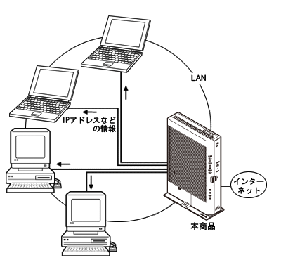 DHCP(Dynamic Host Configuration Protocol)サーバとは、LAN上のパソコンが起動すると、その都度、IPアドレスなどのネットワーク利用に必要な設定情報を、本商品から各パソコンに自動的に割り当てる機能です。