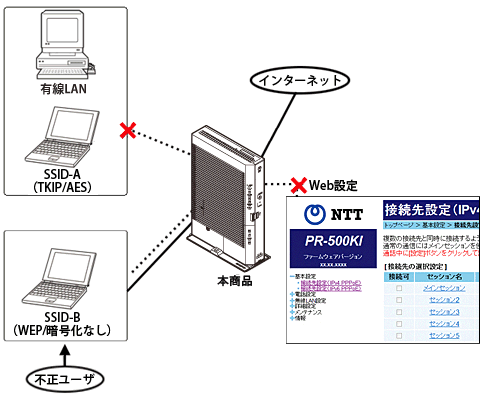 ポートセパレートを使用することによって、悪意ある第三者に、暗号化方式を「WEP」または「なし」に設定しているSSIDに不正に侵入された場合でも、被害を最小限に止めることができます。