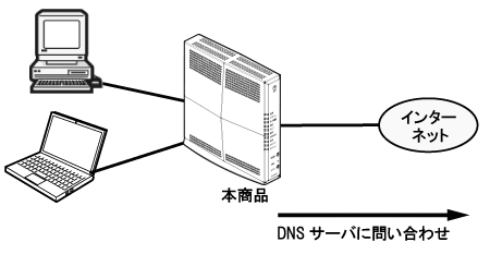 ネットワーク上の各パソコンなどからDNSの問い合わせパケットを受け取ると、インターネット上などの本来のDNSサーバに問い合わせ、問い合わせたIPアドレスを各パソコンなどに回答する機能です。ネットワーク上のパソコンなどからは、本商品がDNSサーバとして動作して
