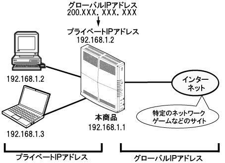 静的NATとは、あらかじめ固定的に使用するパソコンなどのプライベートIPアドレスをグローバルIPアドレスと結びつける機能です。本機能により、WAN側からの通信を指定したパソコンなどで送受信できます。