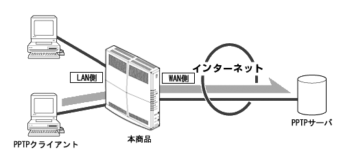 LAN側のPPTPサーバへWAN側のPPTPクライアントからアクセスする場合は、本商品へ静的IPマスカレード設定が必要です。LAN側に設置するPPTPサーバを静的IPマスカレード設定で、WAN側からアクセス可能にします。