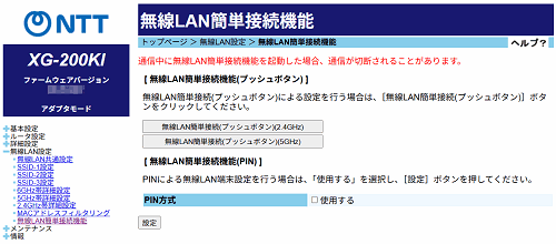 - 「無線LAN端末のPINコード」に無線LAN端末のPINコードを入力し、[無線LAN簡単接続(PIN)(2.4GHz)]または[無線LAN簡単接続(PIN)(5GHz)]をクリックする