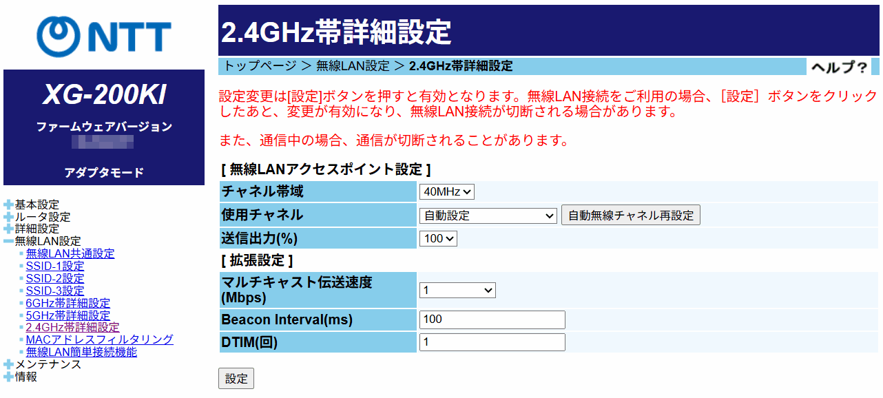 通常は初期値の「1」から変更する必要はありません。マルチキャスト通信を無線LAN接続でご利用中、他の無線LAN端末の伝送速度が低下する場合は、マルチキャスト伝送速度を上げることで改善する場合があります。