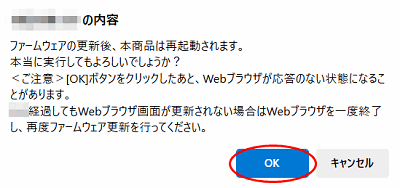 ファームウェア更新中は再起動ボタンを押さないでください。 - 本商品のファームウェアの更新中や、本商品の再起動中、他の設定を実行中は、本商品へのバージョンアップ操作は行えません。