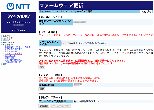 回線の接続状態などにより、ダウンロードに失敗した場合は、ファームウェア更新を実行するときにダウンロードも行います。 - アダプタモードでひかり電話を使用中は、本商品へのバージョンアップを行うことができない場合があります。その場合は、アダプタモードのひかり電話使用終了後、再度ファームウェアの更新を行ってください。