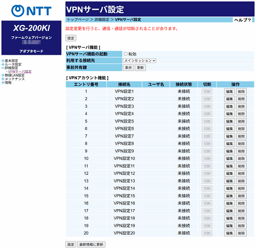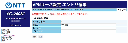 VPNサーバ設定 エントリ編集