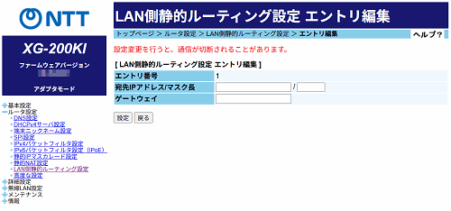 編集したいエントリ番号の[編集]をクリックすると、「LAN側静的ルーティング設定 エントリ編集」の画面が表示されます。