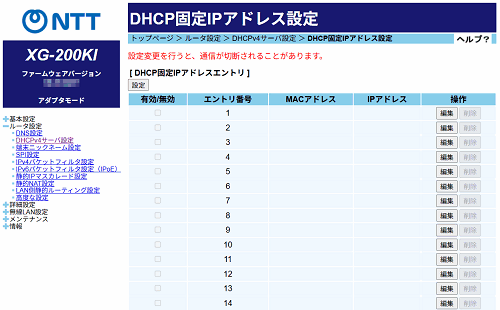 [DHCP固定IPアドレスエントリ]の中から編集したいエントリ番号の[編集]をクリックする