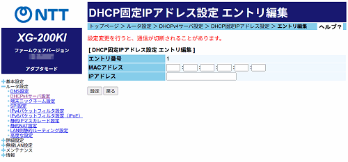 「DHCP固定IPアドレス設定 エントリ編集」の画面が表示されます。