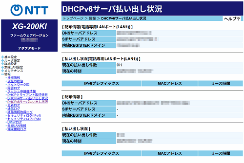 DHCPv6サーバ払い出し状況