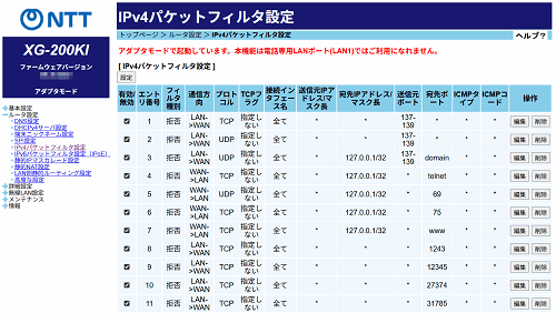 [IPv4パケットフィルタ設定]の中から編集したいエントリ番号の[編集]をクリックする