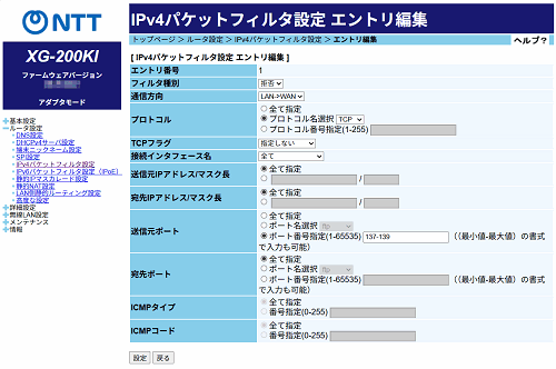 [IPv4パケットフィルタ設定 エントリ編集]