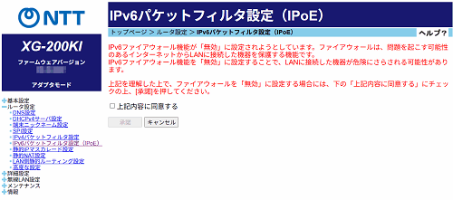 IPv6ファイアウォール機能を無効にしたときの確認画面です。