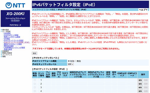 - 「IPv6セキュリティのレベル」を「高度」に設定し、NTT東日本・NTT西日本のNGN内で折り返す通信(NTT東日本・NTT西日本との契約により可能となるもの)を行う場合には、個別に通信を許容するパケットフィルタルールを設定の上、ご利用ください。