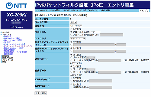 [IPv6パケットフィルタ設定(IPoE) エントリ編集]