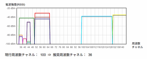 測定された全チャネルの電波強度、現在使用しているチャネルよりも干渉影響の少ないチャネルがある場合には推奨チャネルが画面に表示されます。