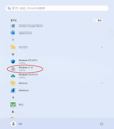- スタートメニューをクリックし、[全て]-[Windowsツール]をクリックする