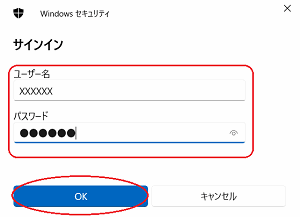 - PPTPサーバに設定しているユーザー名(上段)とパスワード(下段)を入力し、[OK]をクリックする