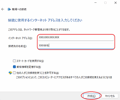 必要に応じて、接続先の名前の入力と各項目をチェックし、[作成]をクリックします。