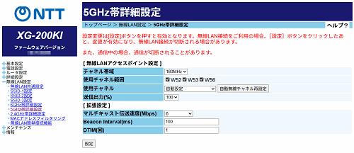 ご利用環境によっては、160MHz/80MHz/40MHz/20MHzモードが自動で切り替わるため、チャネル帯域を160MHzに設定しても、20MHzで接続される場合があります。 - チャネル帯域設定で「40MHz」、「80MHz」、または「160MHz」を利用する場合は、同一周波数帯を使用する他の無線局に対して干渉を与える可能性があります。