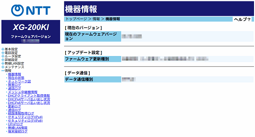 | 機器情報 | 現在のファームウェアバージョン、ファームウェア更新種別、データ通信種別を表示します。 |