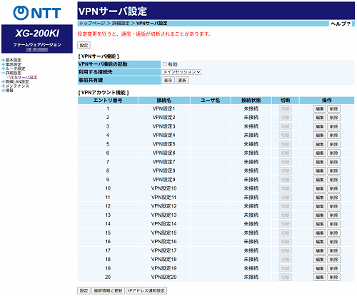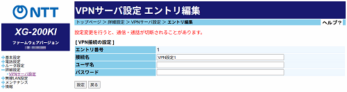 「VPNサーバ設定 エントリ編集」の画面が表示されます。