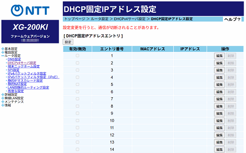 [DHCP固定IPアドレスエントリ]の中から編集したいエントリ番号の[編集]をクリックする
