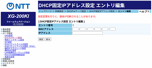 [DHCP固定IPアドレス設定 エントリ編集]