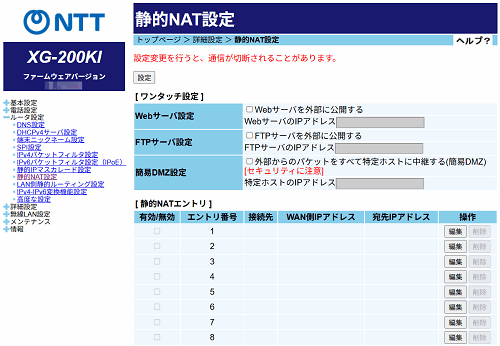 [静的NATエントリ]の中から編集したいエントリ番号の[編集]をクリックする
