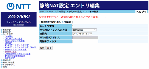 [静的NAT設定 エントリ編集]