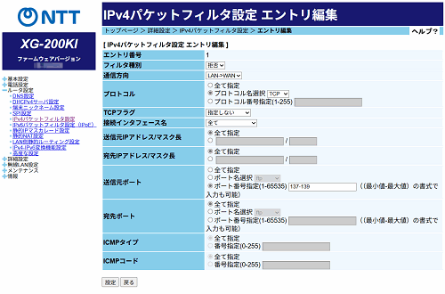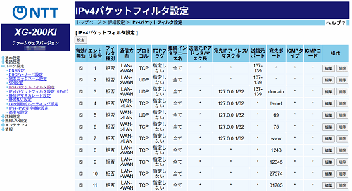 [IPv4パケットフィルタ設定]の中から編集したいエントリ番号の[編集]をクリックする