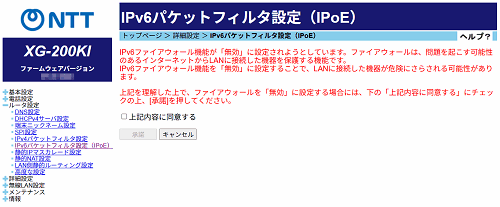 IPv6ファイアウォール機能を無効にしたときの確認画面です。