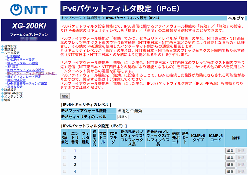 - 「IPv6セキュリティのレベル」を「高度」に設定し、NTT東日本・NTT西日本のNGN内で折り返す通信(NTT東日本・NTT西日本との契約により可能となるもの)を行う場合には、個別に通信を許容するパケットフィルタルールを設定の上、ご利用ください。