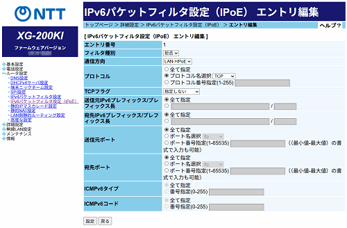 [IPv6パケットフィルタ設定(IPoE) エントリ編集]